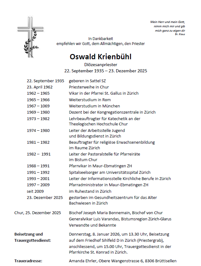 Am 23. Dezember 2025 ist unser langjähriger Seelsorger im Pfarrvikariat Maur Pfarrer Oswald Krienbühl verstorben.